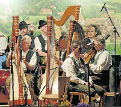Peter Kostner spielte nicht nur mit seinen Wiltenern schneidige Blasmusik, er führte auch mit Elisabeth Rehm-Wank durch das Programm. Er überreichte Vorstand Stefan Baumgartner als Geburtstagsgabe die Noten seines „Miesbacher Trachtenvereins-Marsches“, dessen Premiere das fast vierstündige Volksmusik-Feuerwerk krönte. Zum Jubiläum brachte Fred Kölbl das Unterinntaler Harfentrio (Bild) nach 20 Jahren Pause wieder zusammen.